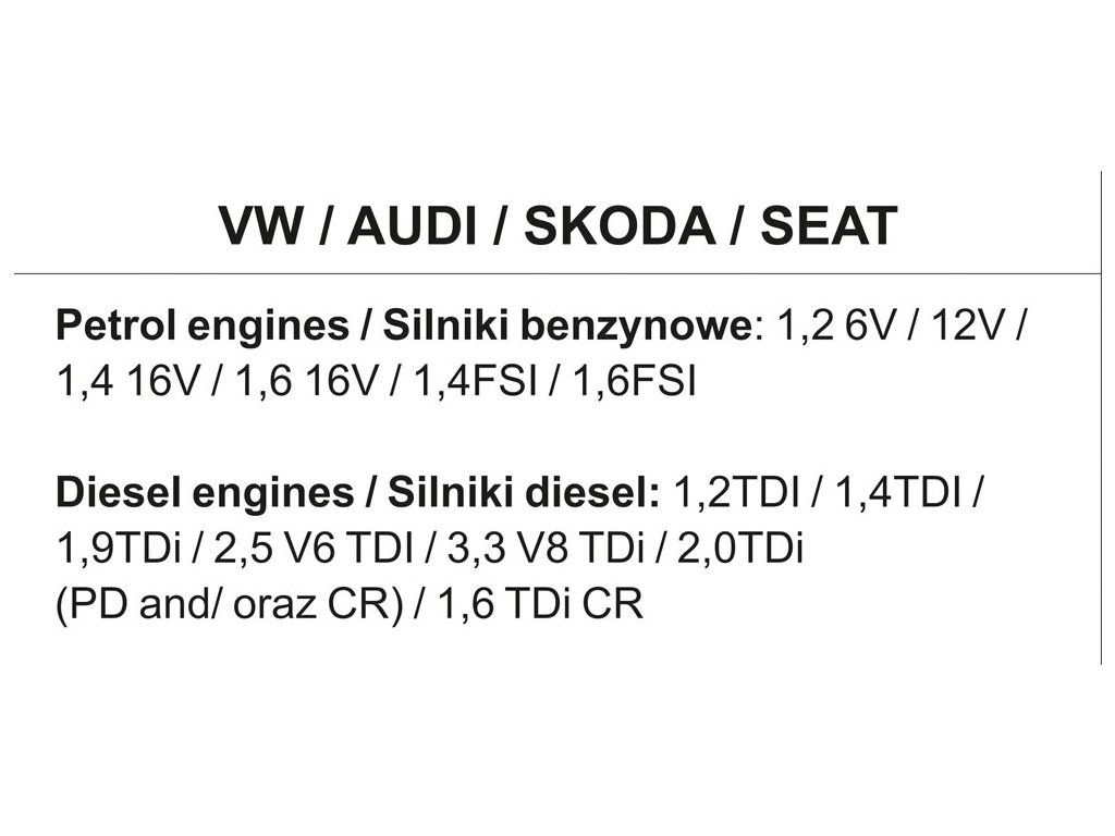 Sada je určena pro benzínové motory 1,2 6V; 1,2 12V; 1.4 - 1.8T 16V a 2,0 16V. Pro naftové motory 1.2 TDI; 1.4 TDI; 1.9 TDI; 2.0 TDI; 1.7 D/TD/SDI/TDI; 1.9 D/TD/SDI/TDI; 2.5 V6 TDI.
