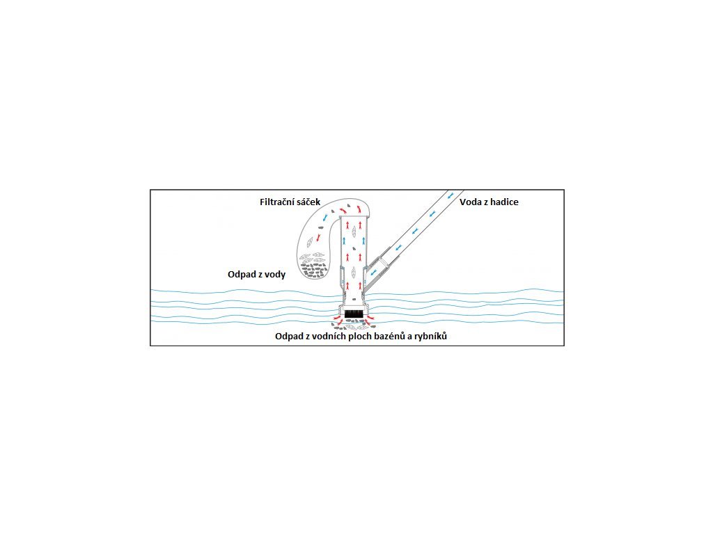 - Čistící účinek zajišťuje proud vody vodovodního řadu ze zahradní hadice napojené na hubici vysavače, podtlakem zvířené nečistoty se usazují v nylonovém sáčku