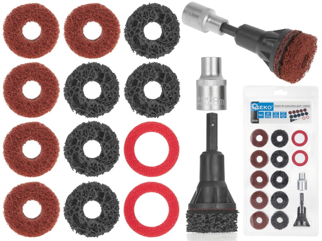 Sada čtrnácti dílů k čištění nábojů a čepů kol, pro upnutí do vrtačky, včetně adaptéru 1/2" do rázového utahováku