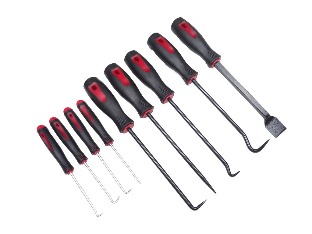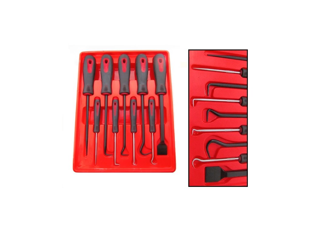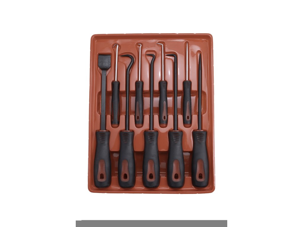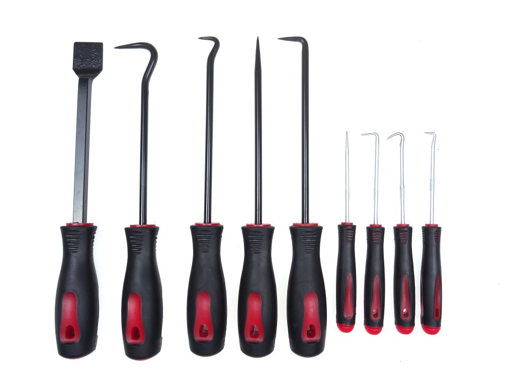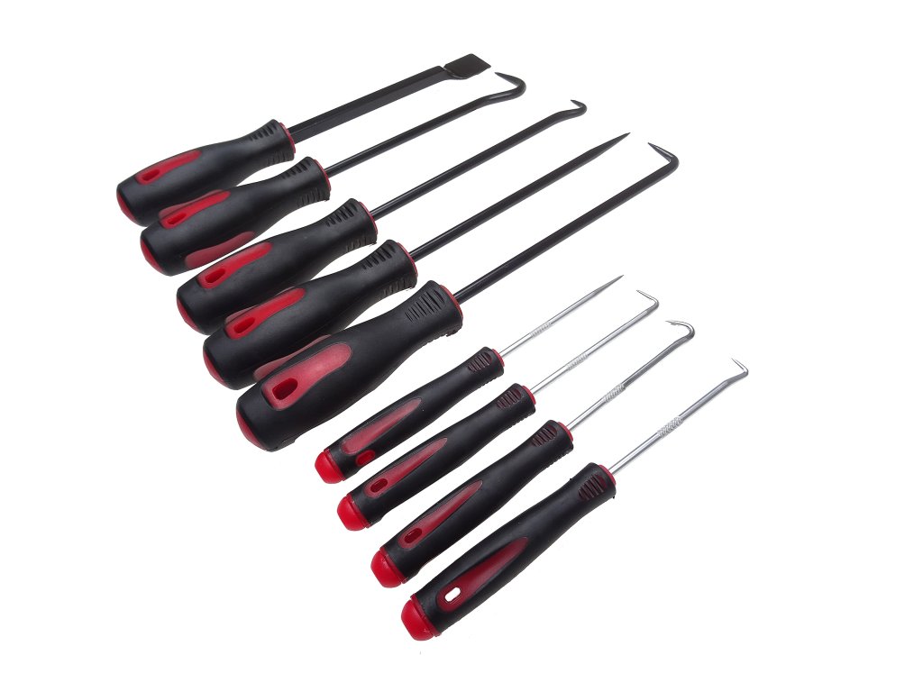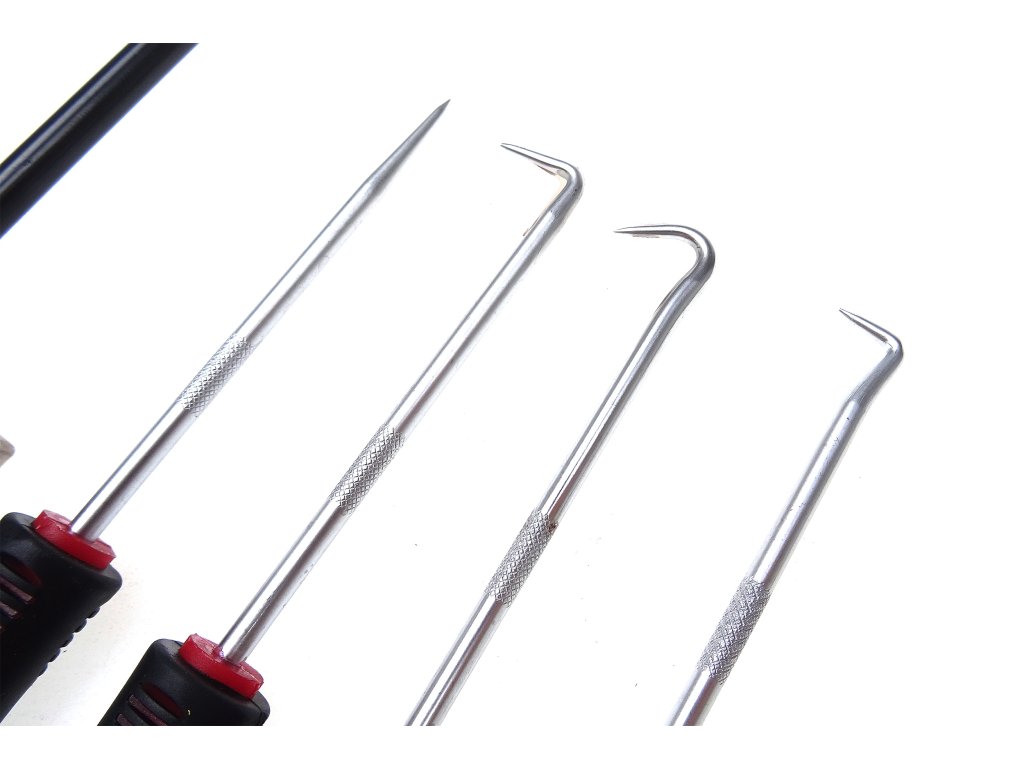 Praktická sada devíti univerzálních ocelových hrotů, špic a škrabky k odstraňování gufer, těsnění, O-kroužků, návleků, seškrabávání ztuhlých nečistot, propichování nádob aj. Háčky a špičky jsou různě velké a zahnuté, díky čemuž bude příští výměna těsnění hračkou.