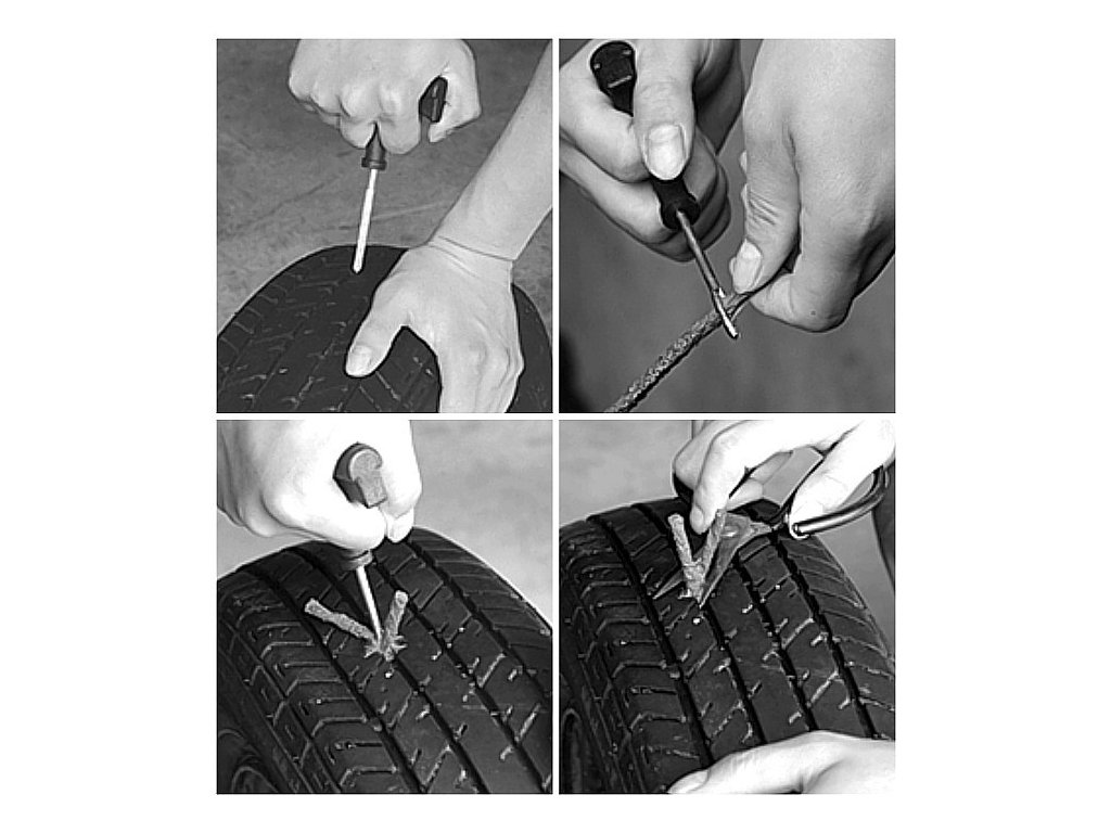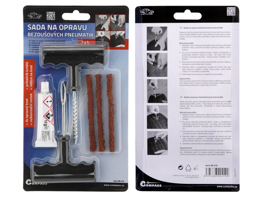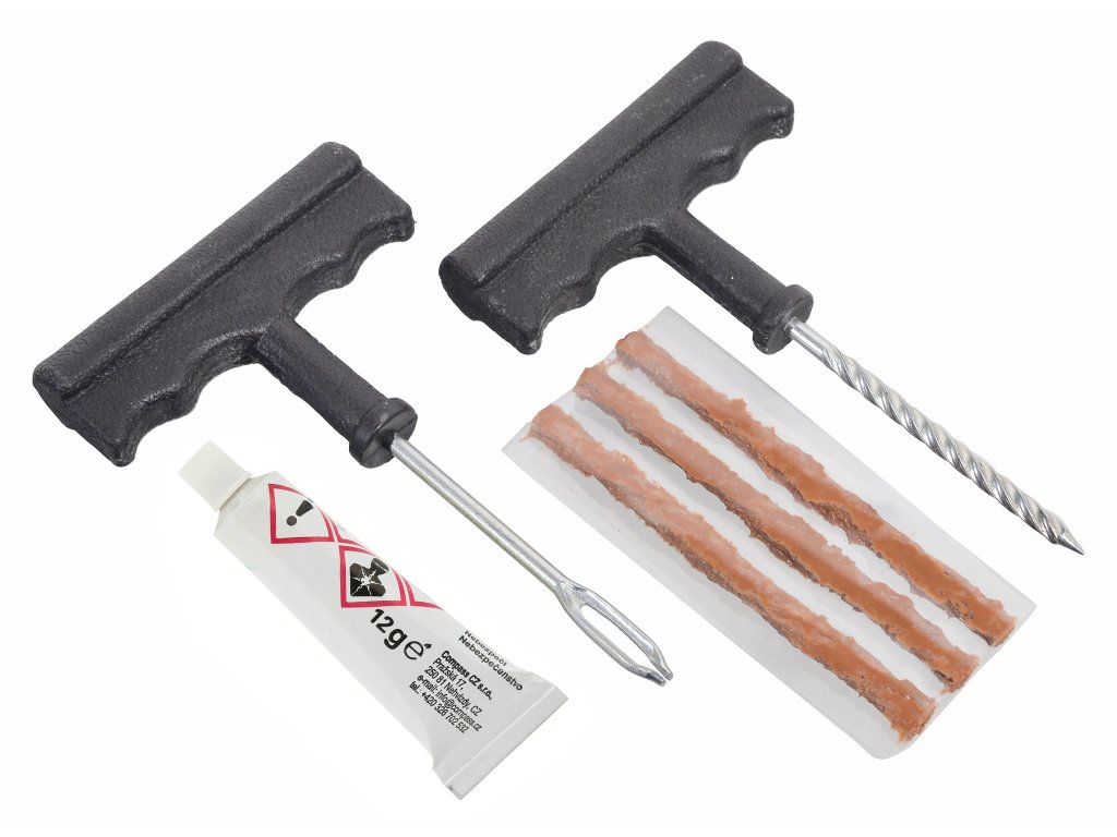 Sada na rychlou opravu bezdušových pneumatik bez nutnosti demontáže pláště z disku. Tato sada je vhodná jak pro automobily, tak pro motocykly, čtyřkolky a další bezdušové pneumatiky.