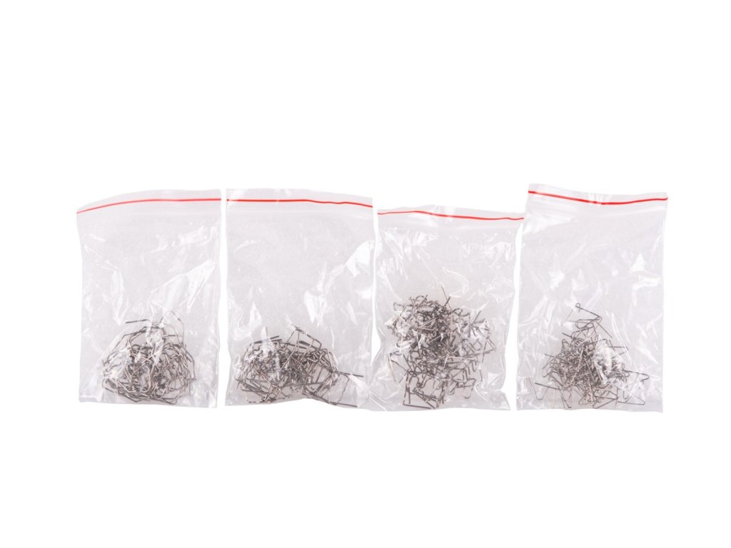 Sada obsahuje 200 ocelových spon čtyř různých druhů, které umožňují přizpůsobit nástroj různým typům plastů a projektů.