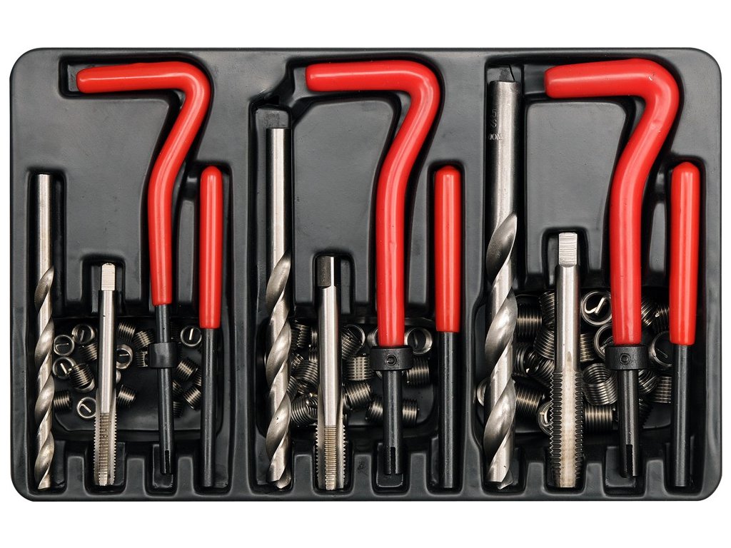Opravná sada poškozených metrických závitů je určena všude tam, kde při poškození závitu nelze použít šroub jiného rozměru, než byl původní. Dále lze závitové vložky využít pro výztuhu závitů v materiálech s nízkou pevností ve střihu například alu nebo hořčíkové slitiny. Obsahem sady pro každý druh závitu je vrták, závitník, zavádeč, vyrážecí trn a závitové vložky z nerezové oceli. Vložky M6 – M10 jsou v balení 25 kusů..