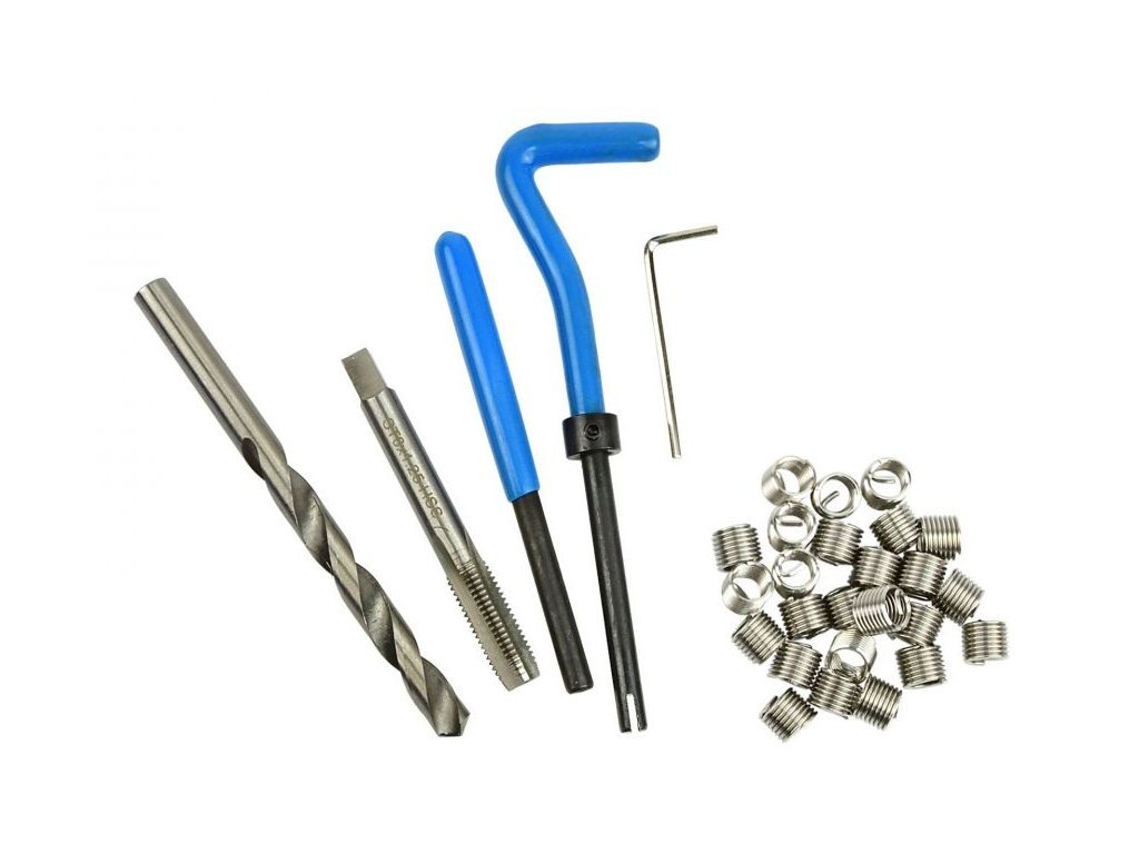 Sada pro opravu zlomených a poškozených závitů M8 x 1.25 mm. Sada obsahuje závitník a vrták z vysoce kvalitní rychlořezné oceli HSS4341, vodicí knoflík, děrovač a sadu spirálových vložek.
