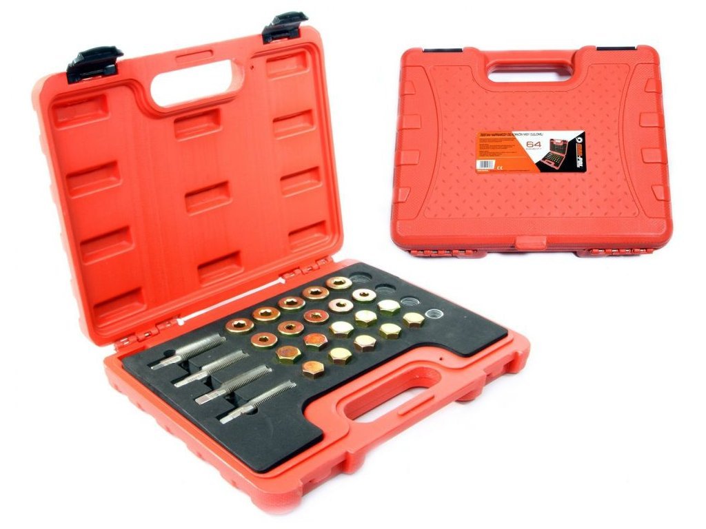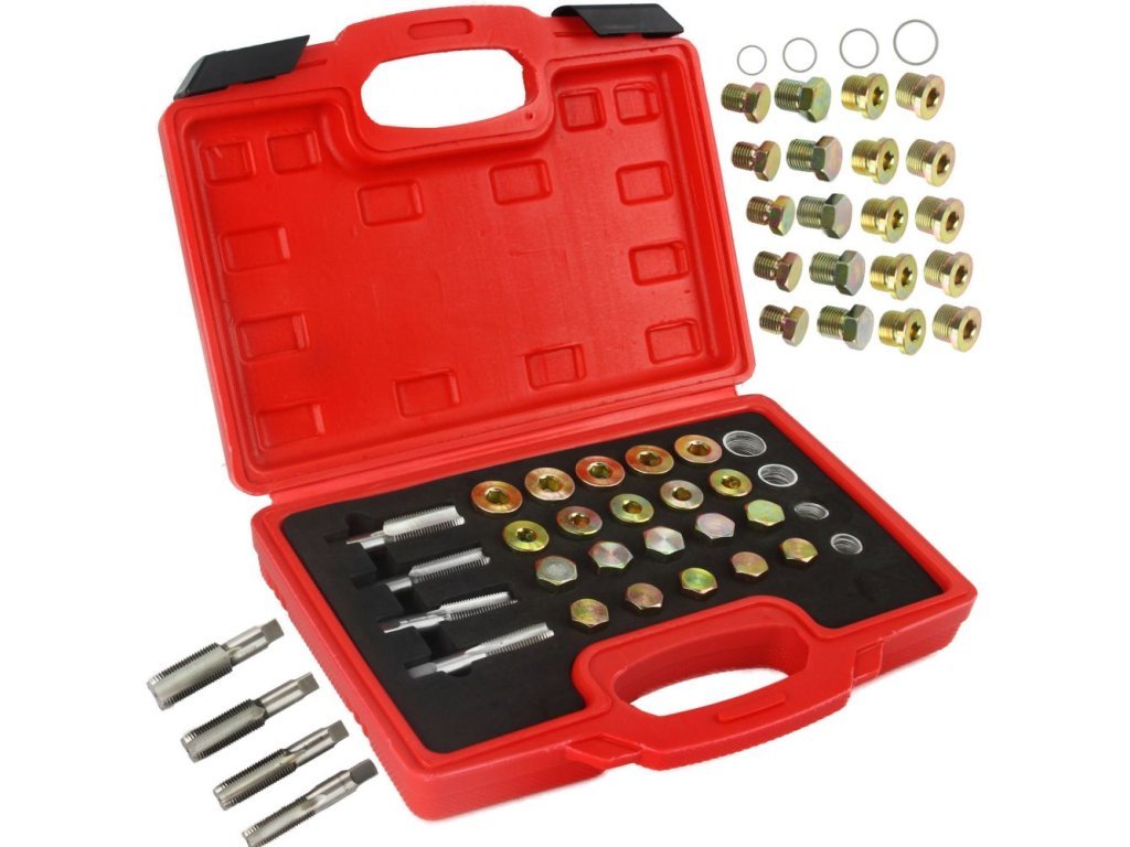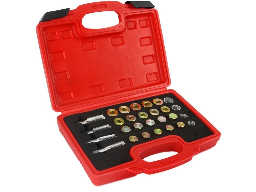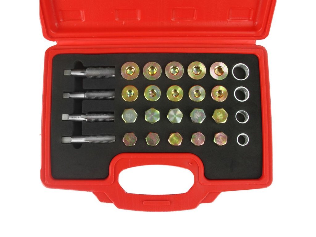 24 dílná sada na opravu závitů olejových van, výpustných a kontrolních šroubů převodovek, diferenciálů a pod. Rychlé řešení pro opravy poškozených závitů šroubů k vypouštění oleje bez drahé výměny olejové vany. Poškozený závit se jednoduše opraví závitníkem, zvětší se na o jeden milimetr větší velikost. Kompletní dodání v plastovém kufříku s pěnovou vložkou. Součástí jsou náhradní šrouby k vypouštění oleje a hliníkové O kroužky.