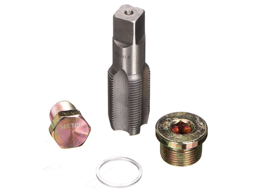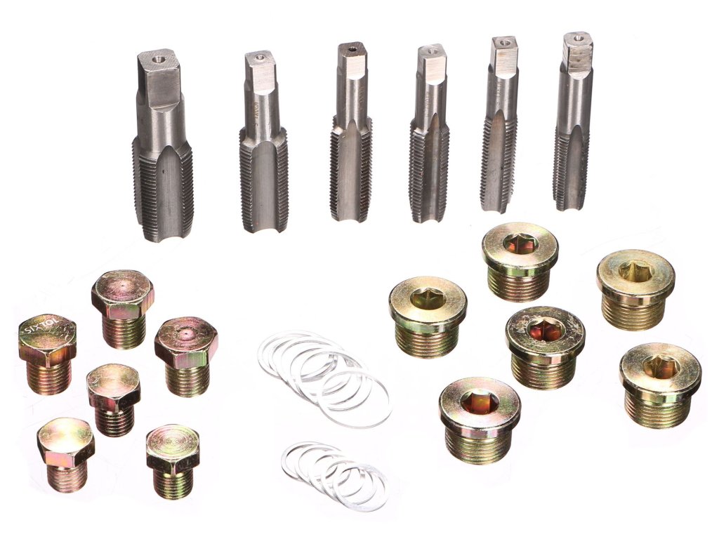 Sada obsahuje závitníky, šrouby a podložky ve velikostech M13-M22 z odolné HSS oceli, které jsou vhodné pro většinu aut nejen při opravě poškozených závitů olejových van, ale také výpustných a kontrolních šroubů převodovek a diferenciálů. Pomocí závitníku jednoduše vyříznete o 1 mm větší závit a našroubujete příslušný šroub.