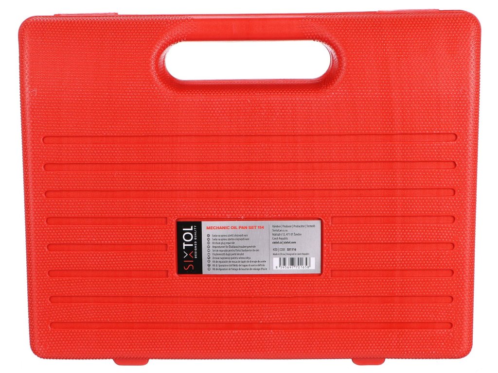 Kvalitní sada nástrojů na opravu poškozených závitů olejových van SIXTOL se 114 díly uložená v praktickém plastovém kufru.