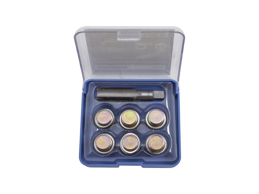 Sada závitníku a šroubů na opravu poškozených a stržených závitů olejových van. Závitníkem snadno a bez demontáže vany zvětšíte poškozený závit o jeden milimetr.