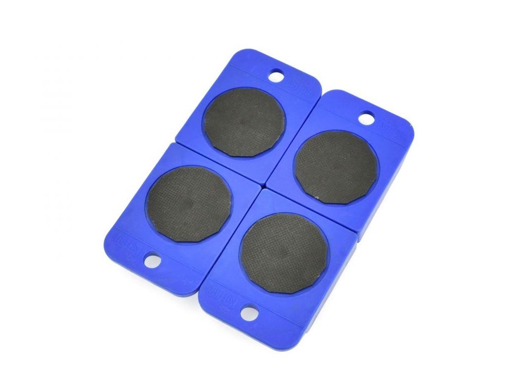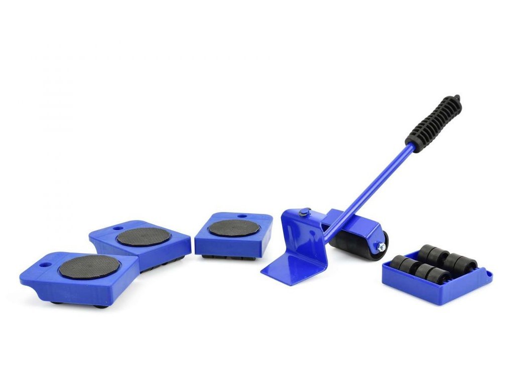 Sada plošin na plastových kolečkách určená pro přepravu a umístění nábytku nebo jiných břemen do hmotnosti 150 kg. Ke zvednutí nákladu před vložením plošin na kolečkách se používá ocelová páka.
