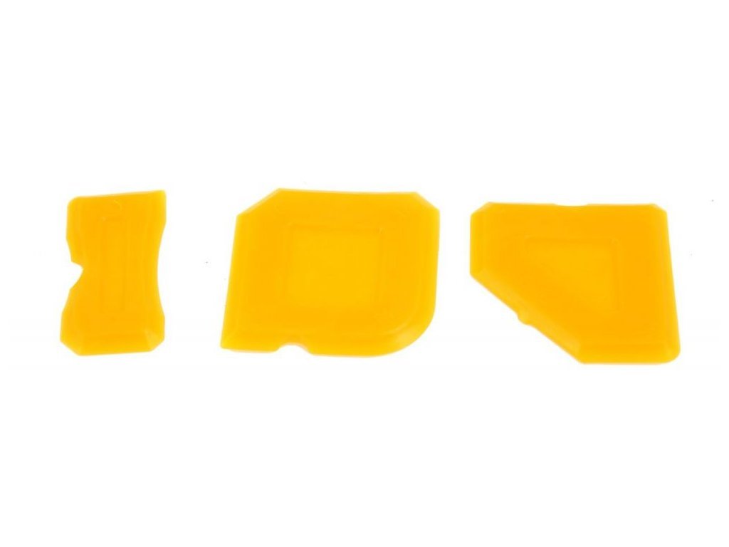 Silikonové stěrky určené pro vyrovnávání silikonových a spárovaných spár. Správně profilované hrany dokonale přitlačují a vyhlazují rovný povrch. Vyrobeno z měkkého pružného materiálu na bázi silikonu. Nepoškozují hrany a nepoškrábou povrch. Sada obsahuje čtyři špachtle různých tlouštěk a profilů. Praktický nůž určený k odstranění přebytečné hmoty.