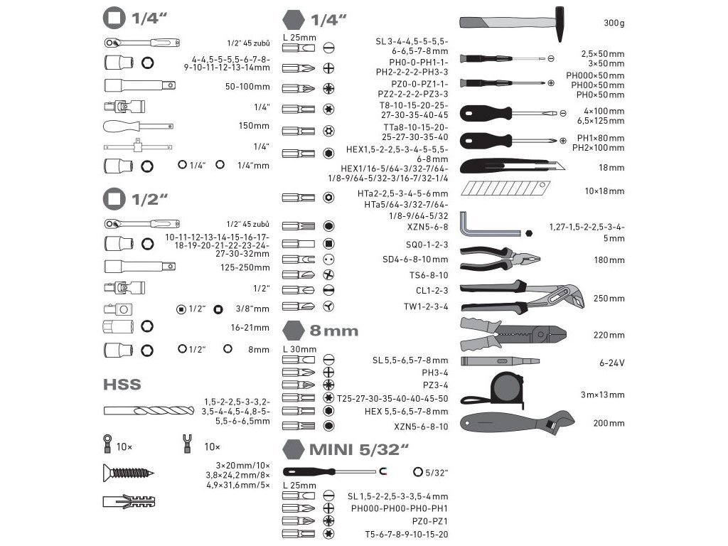 - šroubovák: (-)4x100mm, (-)6,5x125mm, PH1x80mm, PH2x100mm,
