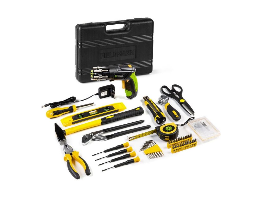 Sada nářadí obsahující přes sto pět kusů včetně oblíbeného aku šroubováku FDS 10102-A jenž je ideálním všestranným pomocníkem. Nedílnou součástí sady jsou kleště kombinované, vodováha, metr a kladivo.Nářadí je uloženo v pevném plastovém kufříku s ergonomickou rukojetí, jejíž umístění zajišťuje otevření kufříku jen ze správné strany tak, aby se nářadí nevysypalo ven.Sada ručního nářadí zahrnuje: