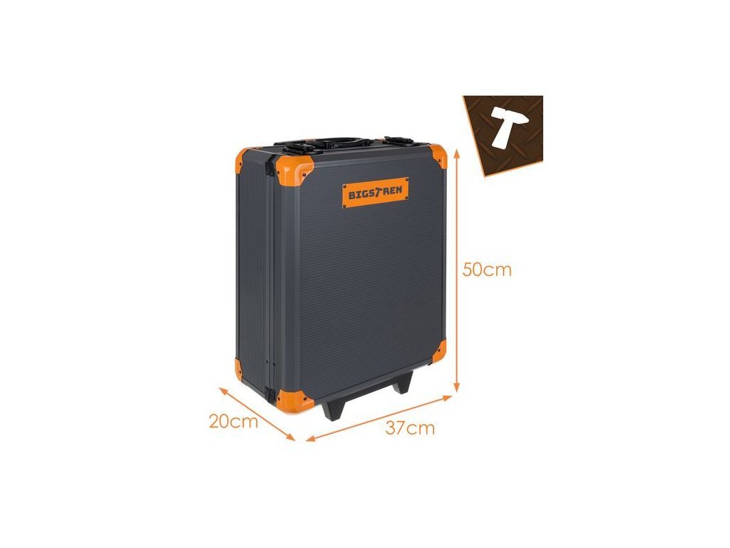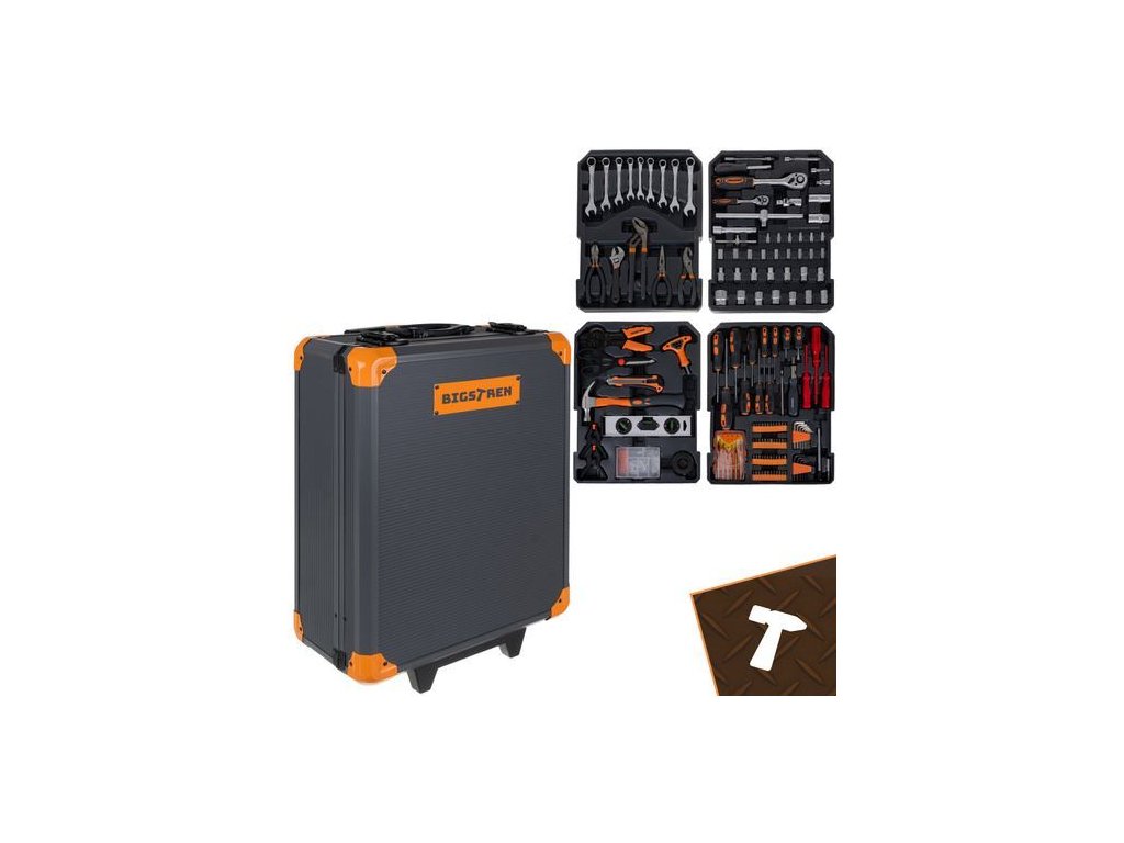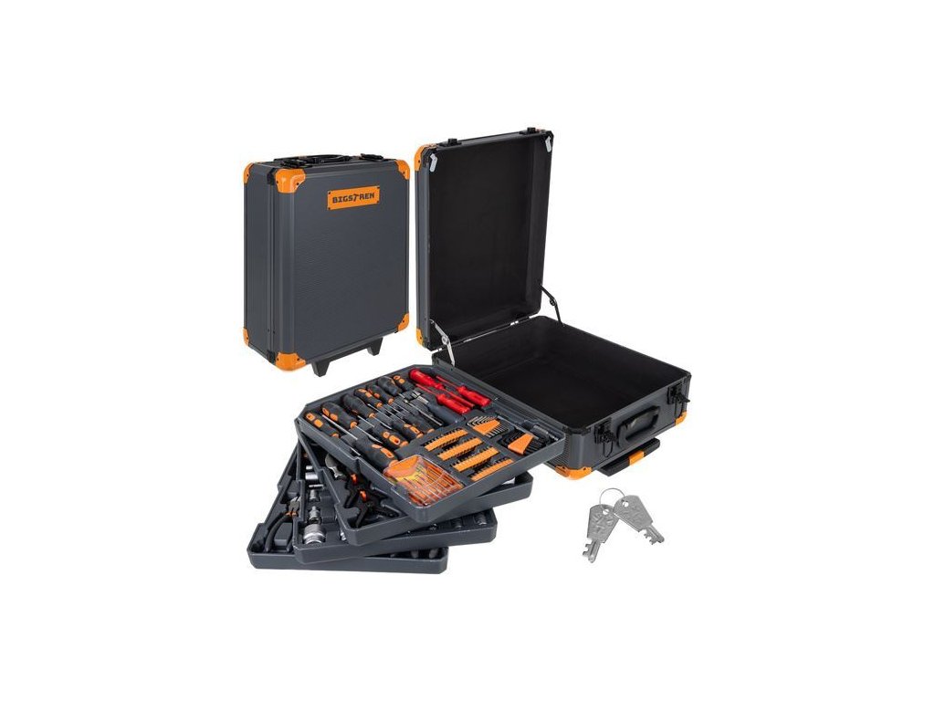 Sada nářadí v kufříku, XXL, Bigstren Tato sada nářadí je jednou z nejkomplexnějších sad nářadí dostupných na trhu. Hliníkové pouzdro obsahuje čtyři vyjímatelné organizéry naplněné klíči, nástrčnými klíči, bity, šroubováky, kleštěmi a montážním příslušenstvím . Sada je navržena tak, aby poskytovala naprostou mobilitu, organizaci a možnost provádět prakticky jakoukoli opravu. Kufr má kolečka, teleskopickou rukojeť a kovové zámky na klíč, díky čemuž je ideální pro domácnost, garáž, dílnu i mobilní práci.Technické specifikace: