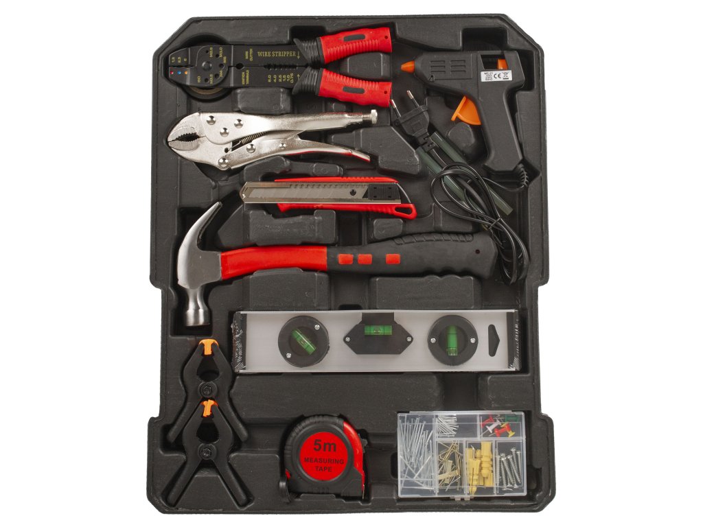 - Sada obsahuje celou řadu kleští, šroubováků, gola klíčů, kladivo, vodováhu, stranové i imbus klíče, bity, základní spojovací materiál a další nářadí, které je vhodné pro použití jak doma, v garáži, tak i na cestách.