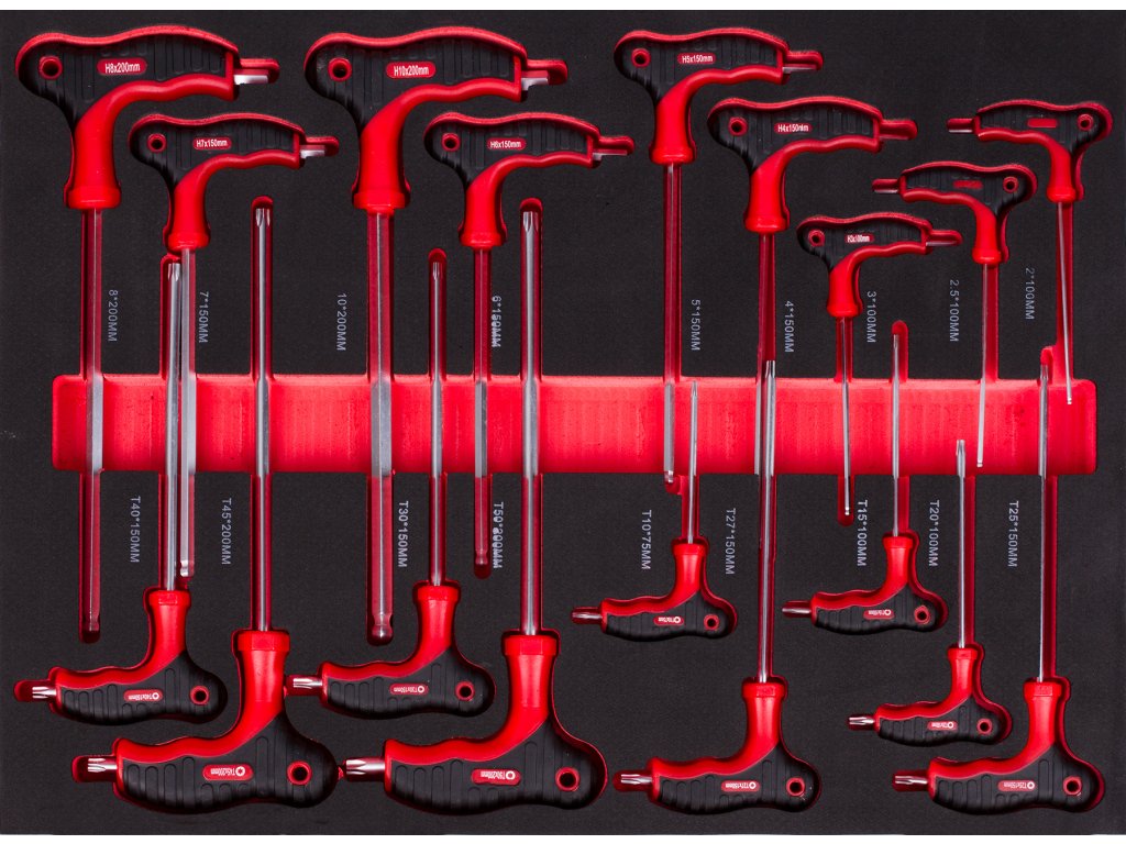| 9 ks | Šroubováky TORX s T-rukojetí: T10 x 75, T15 x 100, T20 x 100, T25 x 150, T27 x 150, T30 x 150, T40 x 150, T45 x 200, T50 x 200 |