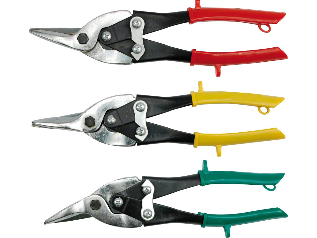 Sada kvalitních vystřihovacích nůžek na plech s čelistmi z chrom niklové slitiny oceli. Tyto vystřihovací nůžky mají břity přizpůsobeny pro stříhání levého a pravého oblouku i pro přímý střih. Břity mají tzv. mikro ozubení, které zamezuje sesmeknutí plechu mimo osu střihu.