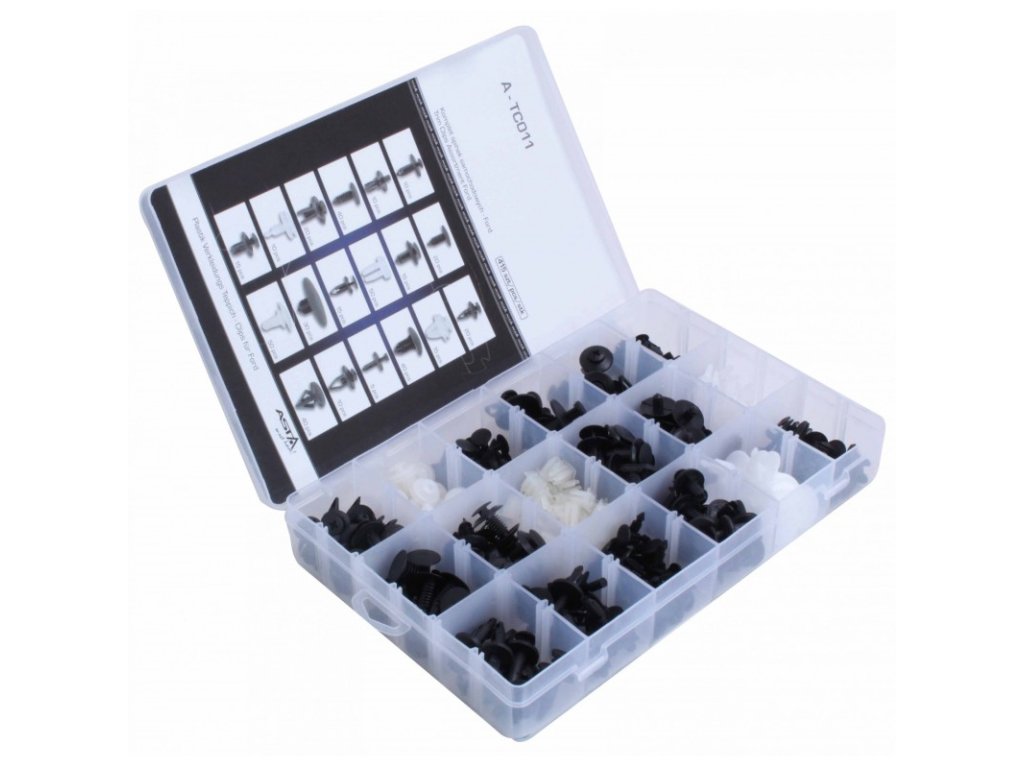 Sada nejpoužívanějších příchytek pro čalounění a plastové díly vozů Ford.