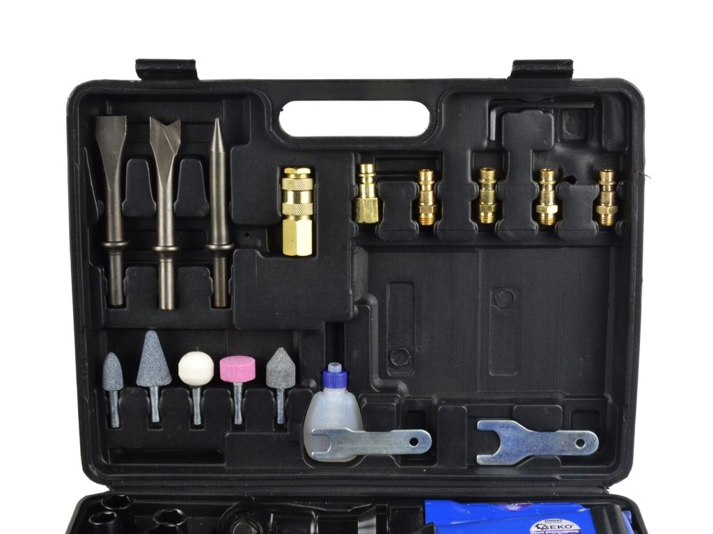 Sada pneumatických nástrojů - rázový utahovák, ráčnový utahovák, bruska a sekáč, 33 dílů