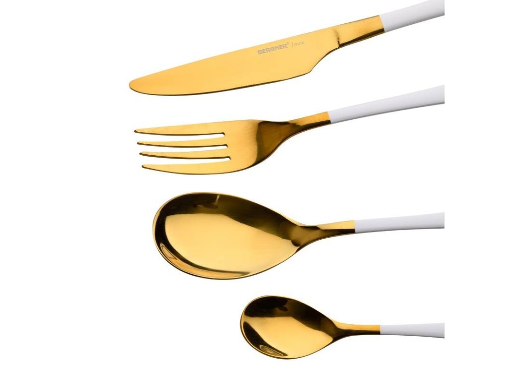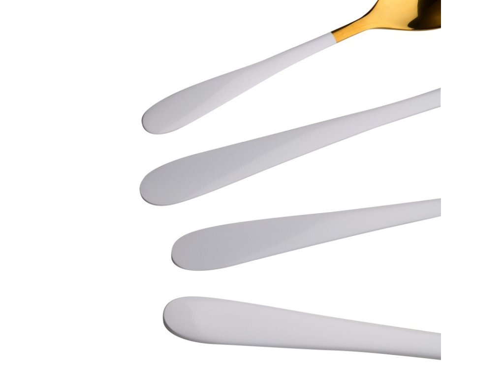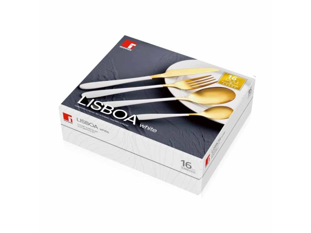 • Nerezové příbory. Bergner, bílá kolekce Lisboa 16 nerezových příborů, zaručující velkou odolnost a dlouhou životnost příborů. •Kompletní a moderní příbory. Skládá se ze 4 lžic, 4 nožů, 4 vidliček a 4 čajových lžiček. Celkem 16 jídelních souprav vyrobených z nerezové oceli. •Elegantní design. Je ideální pro zvláštní příležitosti, jídlo nebo zvláštní událost na oslavu s blízkými. Přináší na stůl dotek odlišnosti a dobrého vkusu. • Nabízí moderní dotek. Sada příborů je zlatá s matně bílou rukojetí. Mají moderní, lesklý povrch a jiný, elegantní styl. •Praktický. Tyto nerezové příbory nabízejí vynikající vlastnosti. Jsou snadno omyvatelné a vhodné do myčky. Zachovají si odolnost a vzhled.16dílná sada příborů sestávající ze 4 stolních nožů 23,5 cm, 4 stolních vidliček 21 cm, 4 polévkových lžic 21,5 cm a 4 čajových lžiček 14 cm. Vyrobeno z vysoce kvalitní odolné nerezové oceli s lesklým zlatým PVD povrchem a červeně lakovanou rukojetí. Sada příborů, která je nejen mimořádně funkční, ale také oblékne váš stůl elegancí bílé. Snadné čištění, doporučujeme ruční čištění pro prodloužení životnosti produktu.