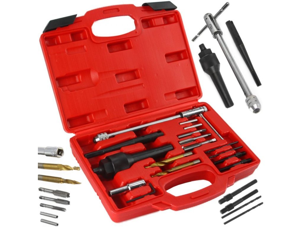 Sada přípravků na demontáž zlomených, prasklých nebo jinak poškozených žhavících svíček. Sada umožňuje odstranit zlomené, poškozené nebo zapečené svíčky bez poškození motoru nebo závitu pro žhavící svíčku. Sada obsahuje stupňovitý vrták pro odvrtání zlomených svíček, závitovou ráčnu, závitníky, nástrčné hlavice a další přípravky.