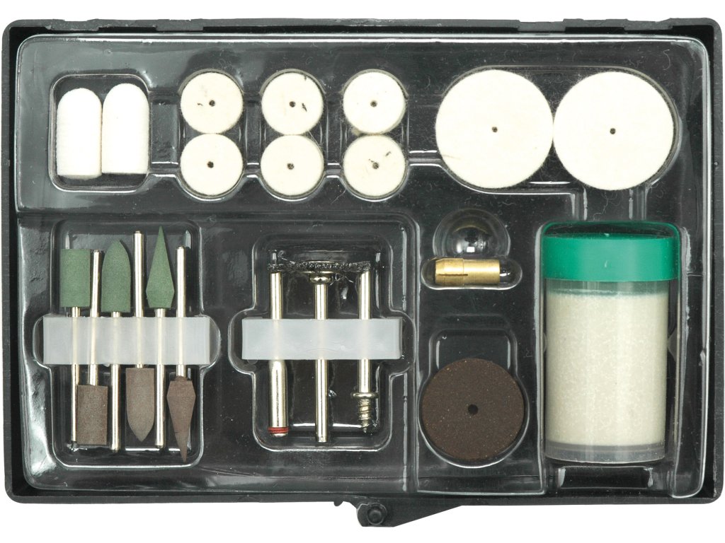 Sada 22 ks doplňků k doplnění základního vybavení rovné brusky. Umožňuje rychlou, snadnou a hospodárnou práci. Příslušenství umožňuje přesné zpracování malých prvků. Vhodné pro brusky s otvorem nástroje 3,2 mm.