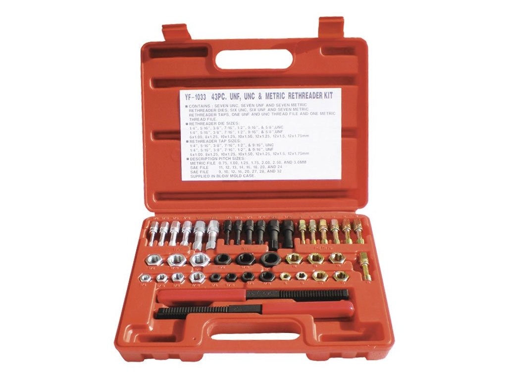 Sada přípravků pro opravy metrických i palcových závitů v plastovém kufříku obsahuje tyto komponenty: přípravky pro opravy závitů šroubů - UNF 6x1,0, 8x1,25, 10x1,25, 10x1,50, 12x1,25, 12x1,5, 12x1,75 mm a 14 palcových rozměrů, přípravky pro opravy závitů matic apod. - UNF 6x1,0, 8x1,25, 10x1,25, 10x1,50, 12x1,25, 12x1,5, 12x1,75 mm a 12 palcových rozměrů, 1 speciální pilník pro opravy metrických závitů a 2 obdobné pilníky pro palcové rozměry.