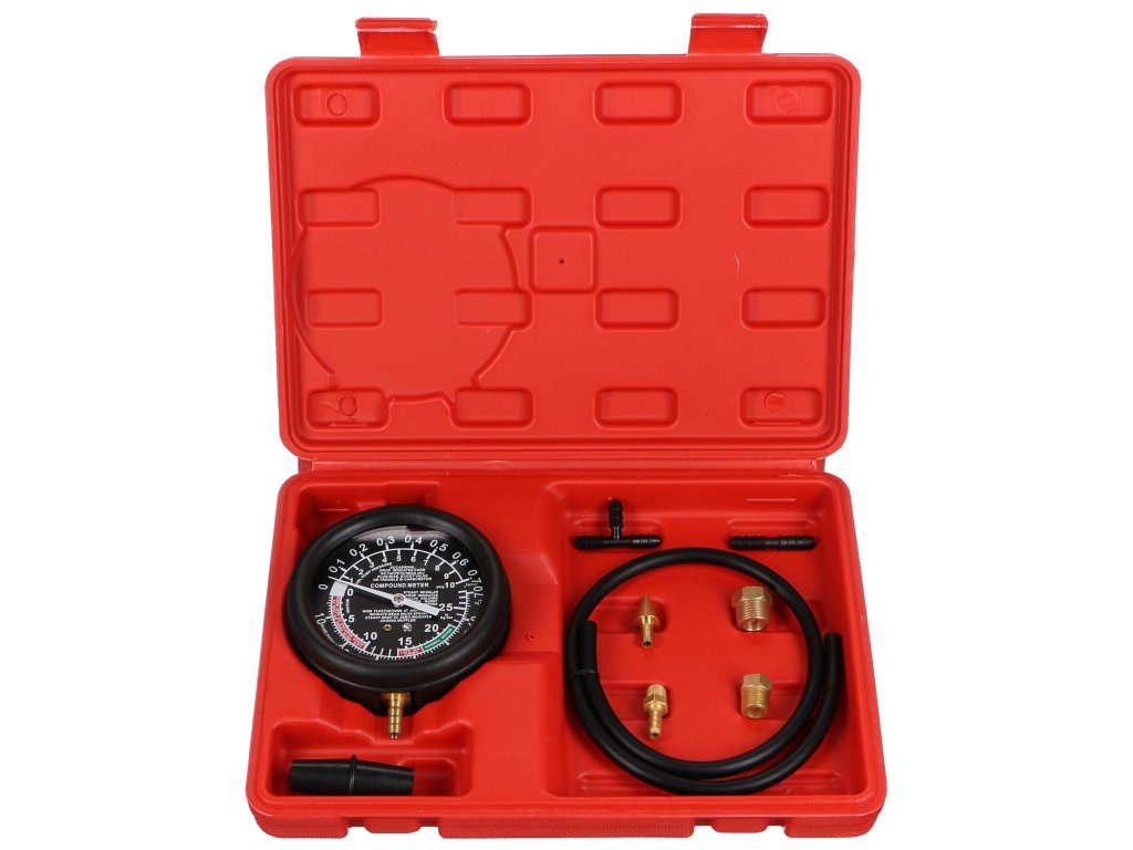 Servisní 9dílná sada pro podtlakové/vakuové testování palivového čerpadla SIXTOL MECHANIC FUEL TESTER 9 s analogovým manometrem se stupnicí 0-0,7 bar a 0-10 psi. Sada obsahuje ohebnou hadici a řadu nástavců. Nástroje jsou uloženy v plastovém kufříku, který usnadňuje jejich skladování a přenos.
