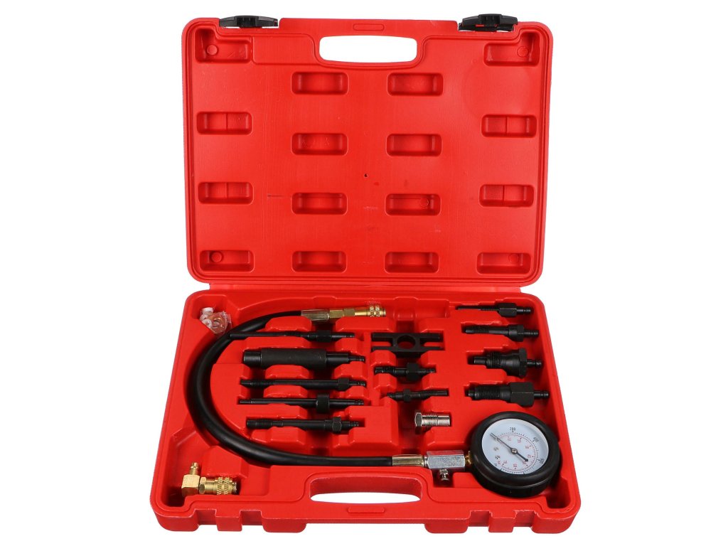 Servisní 23dílná sada pro testování komprese naftových motorů SIXTOL MECHANIC ENGINE TESTER 23 s analogovým manometrem se stupnicí 0-70 bar a 0-1000 psi. Sada obsahuje ohebnou hadici, širokou škálu nástavců a podložek. Tato sada pomáhá odhalit opotřebení a netěsnosti kolem pístních kroužků a další nedostatky, způsobující únik tlaku z motoru. Nástroje jsou uloženy v plastovém kufříku, který usnadňuje jejich skladování a přenos.