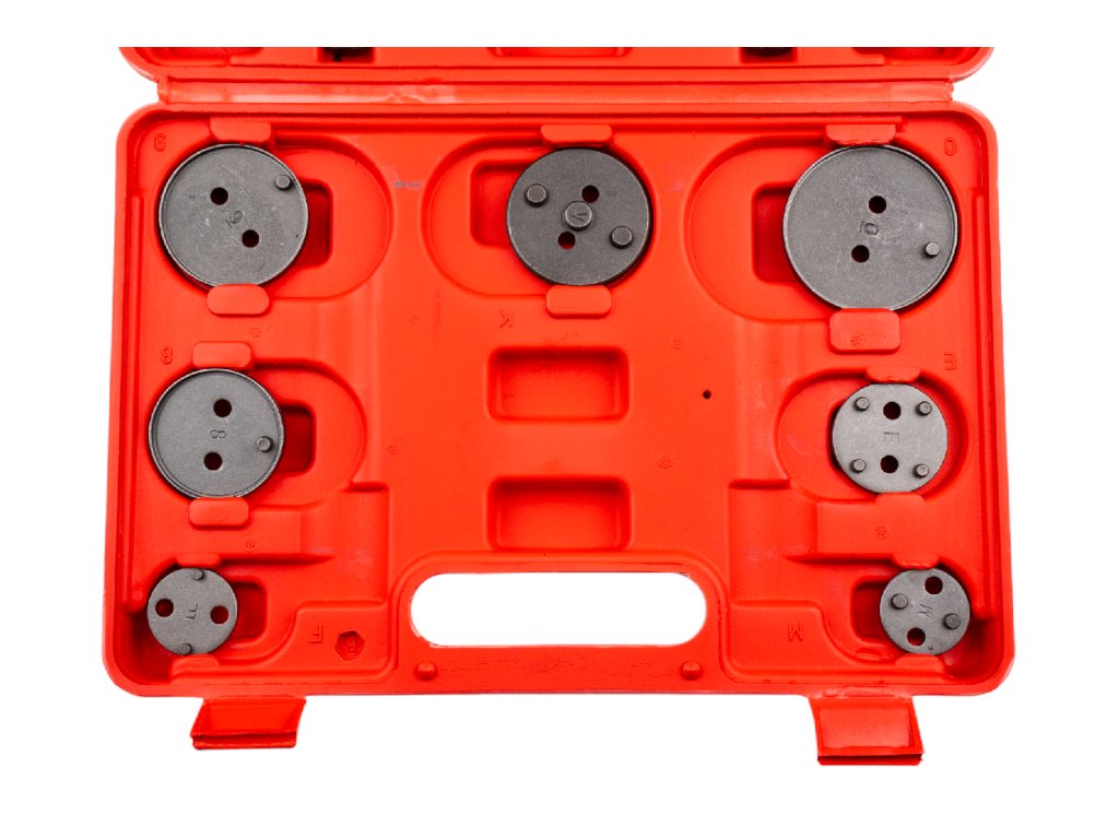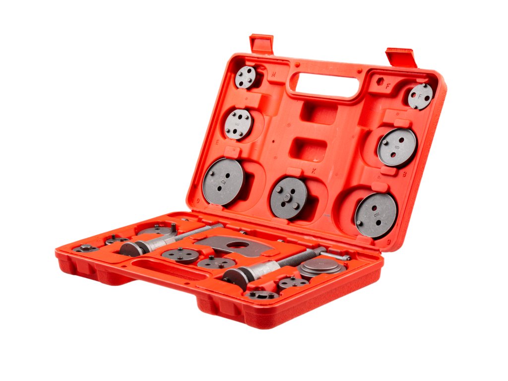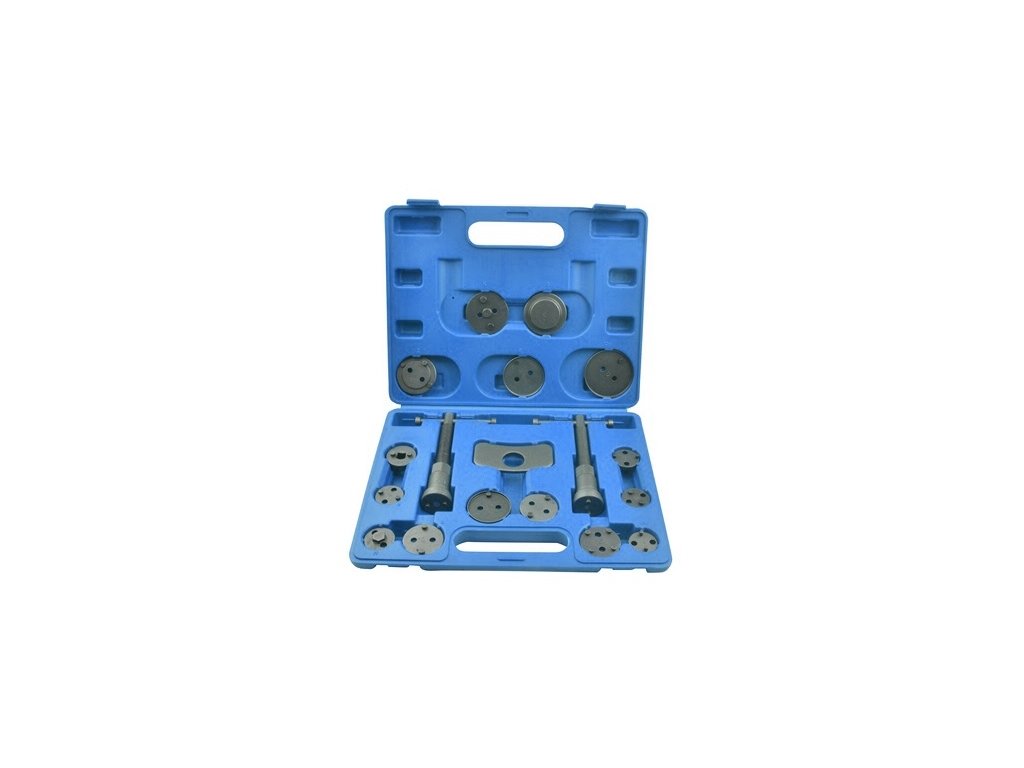Profesionální sada na zatlačení brzdových pístků při výměně brzdových destiček ve třmenech kotoučových brzd, včetně těch s integrovanou ruční brzdou. Sada obsahuje 15 různých adaptérů pro pístky různých velikostí – ploché pro klasické zatlačení, i nástavce s kolíčky pro zpětné šroubování (u vozidel s ruční brzdou integrovanou do třmenů se zpětné vracení brzdových pístů provádí zpětným otáčením, u ostatních vozidel nebo na předních brzdách prostým stlačením).