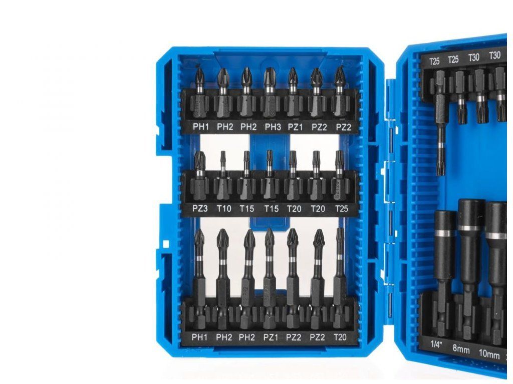 - 20 ks úderových bitů S2, 25 mm: PH1, PH2, PH2, PH3, PZ1, PZ2, PZ2, PZ3, T10, T15, T15, T20, T20, T25, T25, T30, T30, T40, T40, SL6