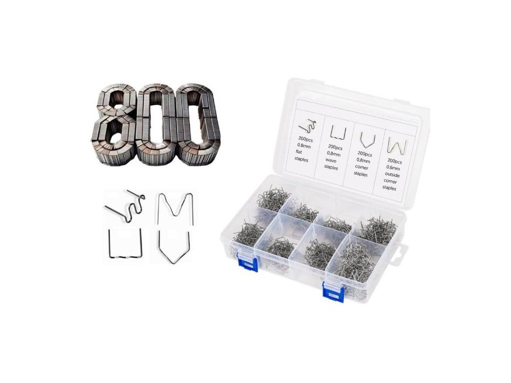 Sada sponek pro svářečky plastů 800ks Sada svařovacích hrotů pro svářečky plastů pro opravu plastů různých druhů. Jsou vyrobeny z vysoce kvalitního materiálu, pevné a odolné vůči korozi. Odolné i vůči povětrnostním podmínkám a neztrácejísvoji pevnost ani po dlouhé době. Souprava obsahuje 8 různých velikostí a tvarů, aby vyhovovaly různorodým pracím. Jsou navrženy tak, aby dokonale spojily prasklá místa a dodaly jim extra pevnost. Sponky jsou vhodné pro opravu plastů ABS, PVC, nylon atp.Ploché spony 100 x 0,6 mm