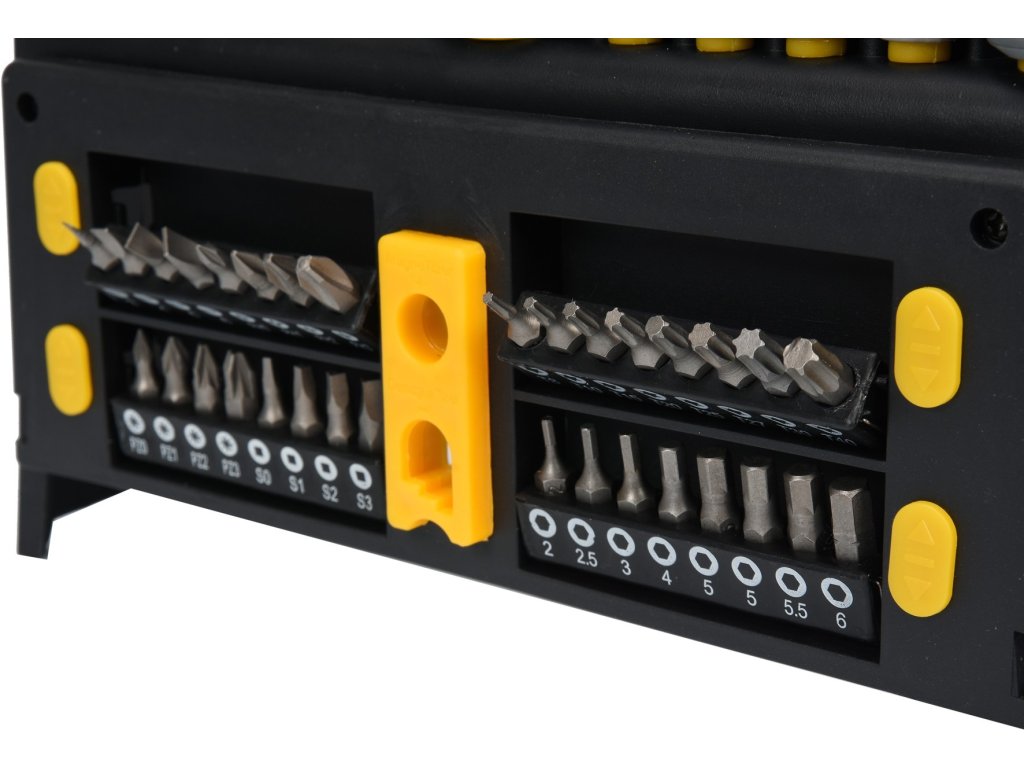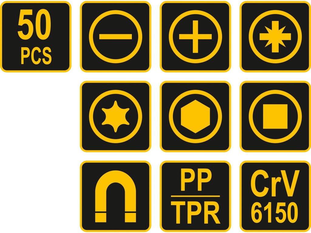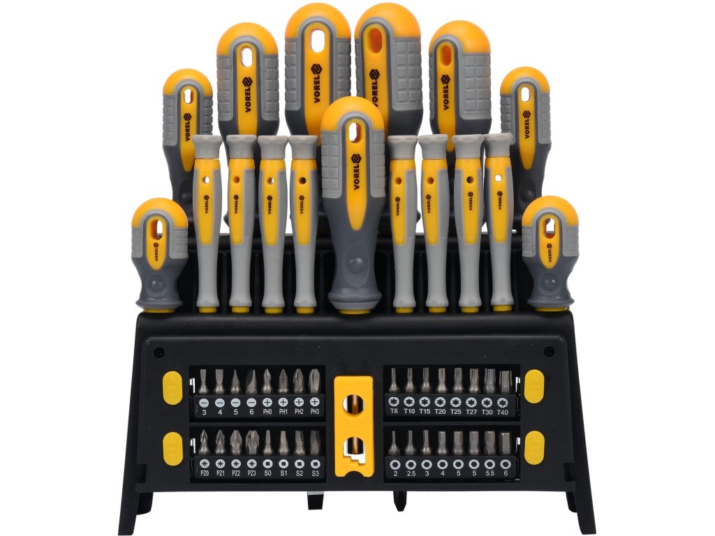 Sada 50ks šroubováků vyrobených z CrV6150 oceli s ergonomicky tvarovanými rukojeťmi z protikluzného PP a TPR.