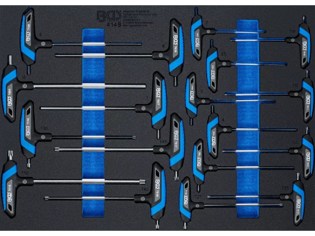 Sada je uložena v tvrzené pěnové vložce 3/3, která nářadí chrání a drží v přesných prohlubních proti posunu. Přehledné uspořádání usnadňuje rychlé nalezení požadované velikosti a vložka je vhodná pro všechny dílenské vozíky BGS i systém nástěnných skříněk.