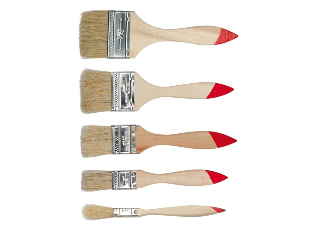 Sada pěti plochých štětců anglického typu. Štětiny orámované kovovou objímkou ??na dřevěné lakované rukojeti.