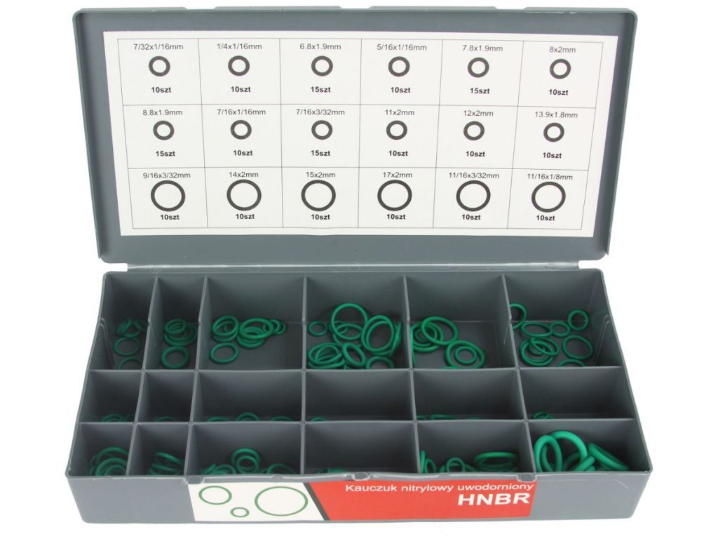 Těsnící O-kroužky HNBR, NBR (metrické a SAE) v sadě 900 ks uložené ve třech praktických kufřících umístěných ve stojanu. Součástí sady je organizér, do kterého lze uložit jen potřebná těsnění bez nutnosti přenášení celého stojanu s kufříky. Uplatnění nalezne v servisech, dílnách.