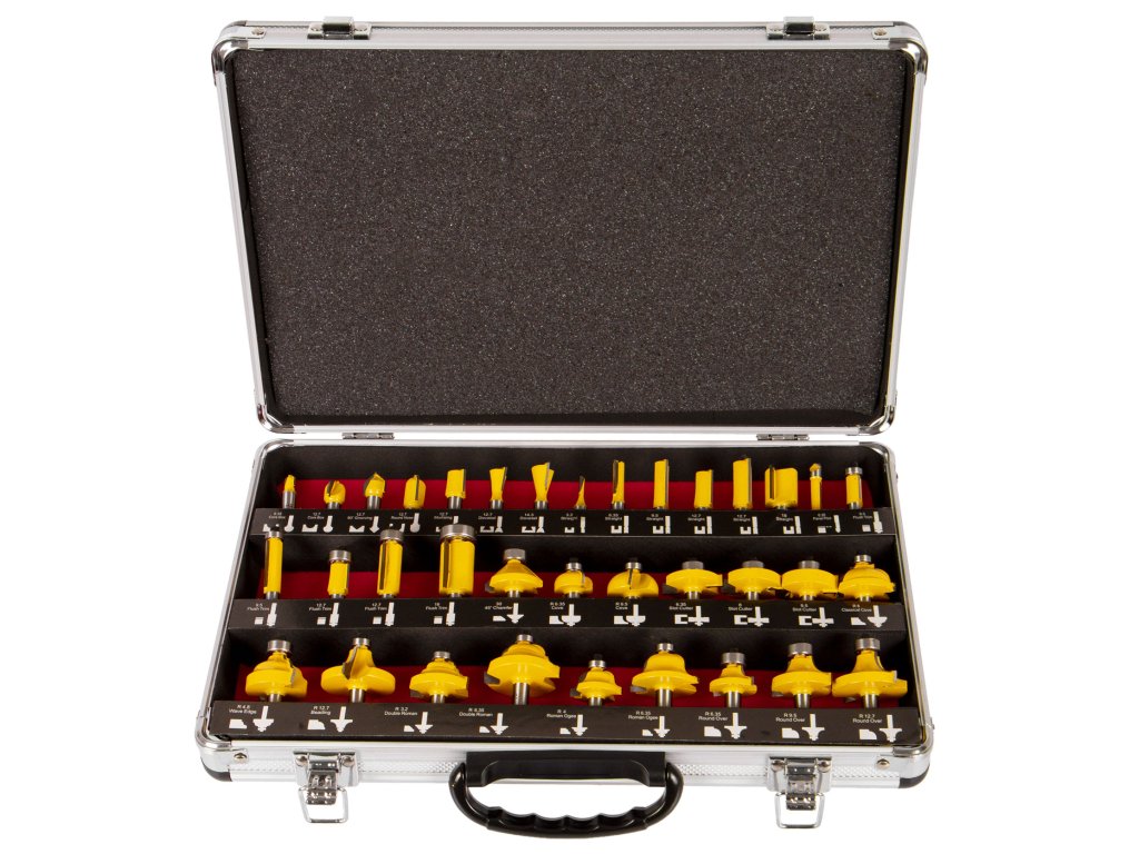 Sada 35 ks kvalitních tvarových fréz do dřeva s průměrem stopky 8 mm, která přijde vhod každému pracovníkovy s frézkou.