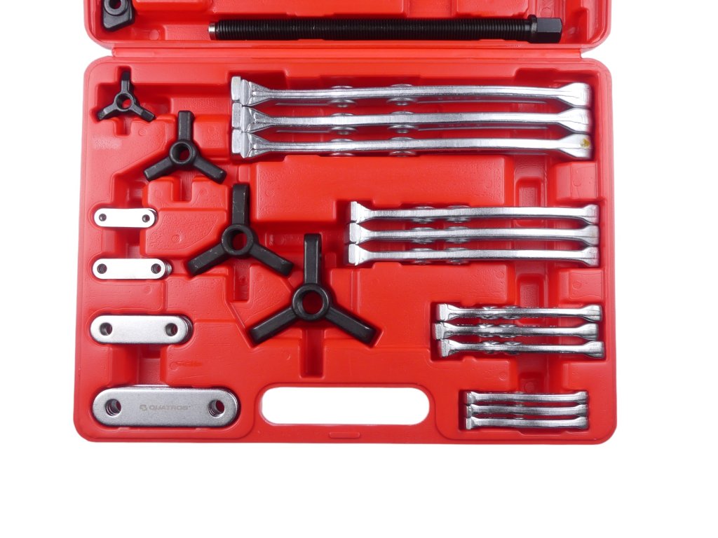 Velká souprava nastavitelných stahováků, 2 a 3 ramenné, 4 různé velikosti (délka ramen: 75-200 mm), v plastovém kufru, univerzální – QUATROS QS11125.