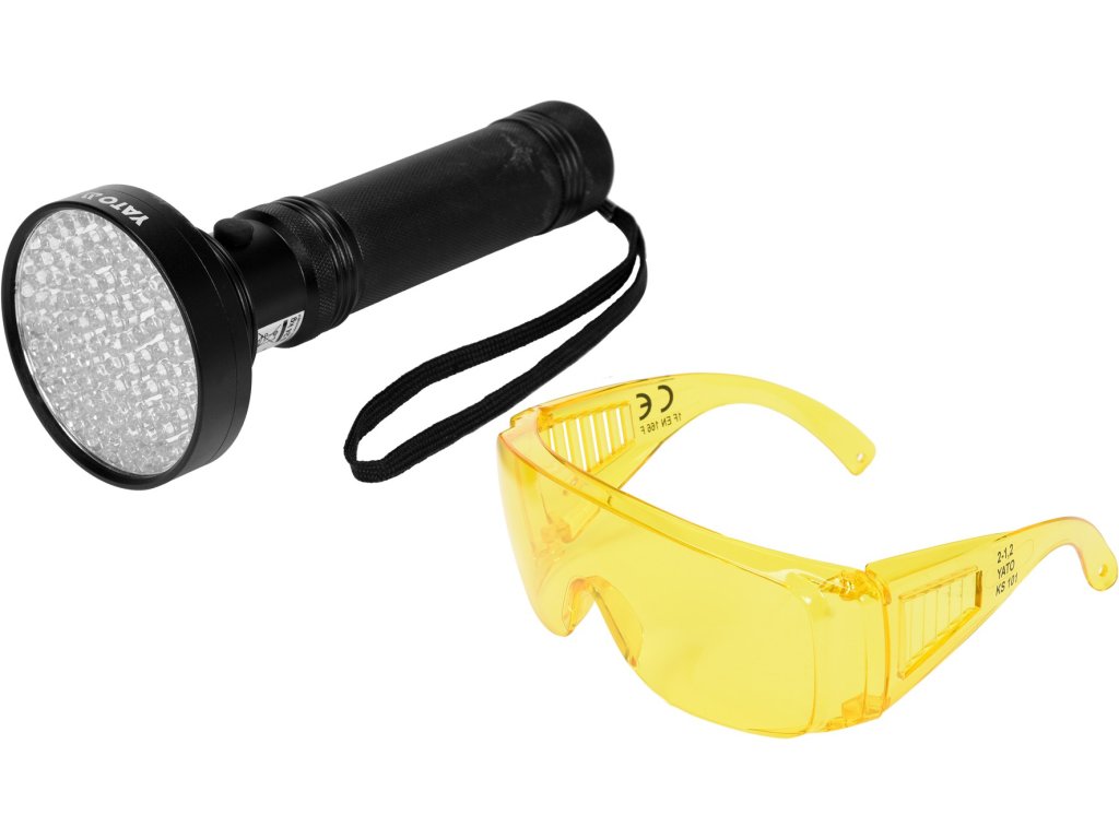 Počet 100 LED UV poskytuje velmi silný paprsek záření pro usnadnění detekce úniku. Součástí balení jsou ochranné brýle proti UV záření, které splňují požadavky evropské směrnice o osobních ochranných prostředcích.