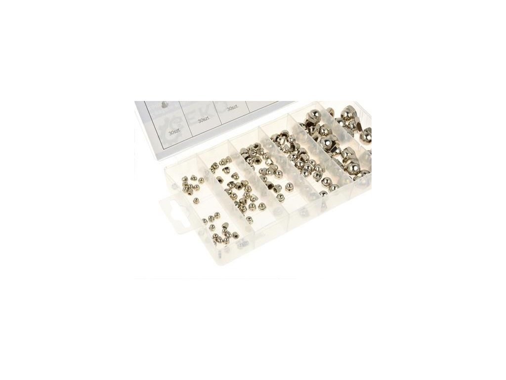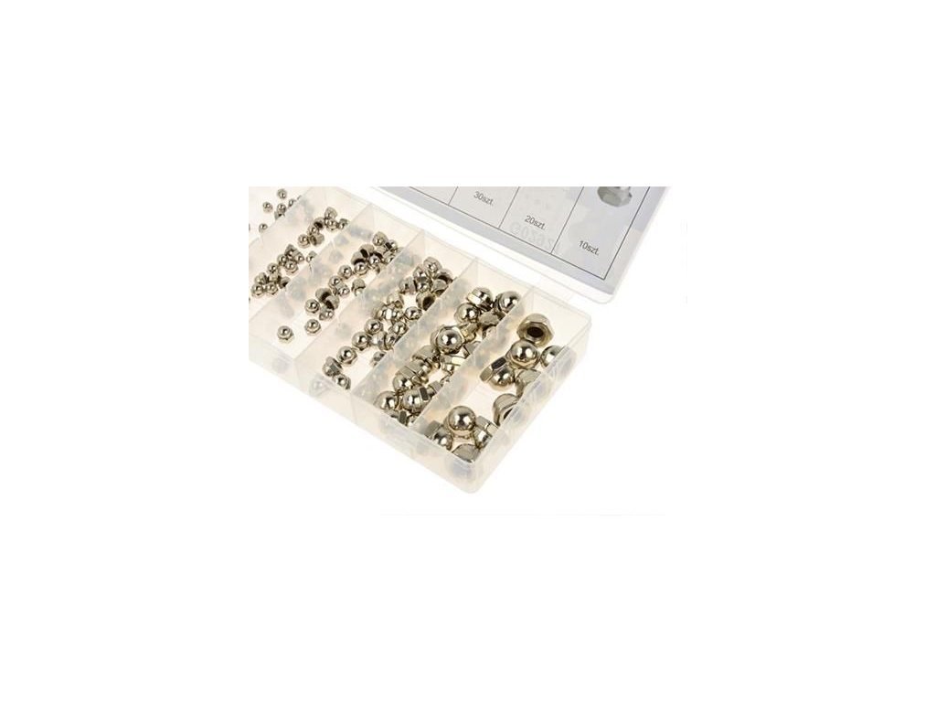 Sada uzavřených krycích matic v praktickém balení ve velikostech M3, M4, M5, M6, M8, M10.