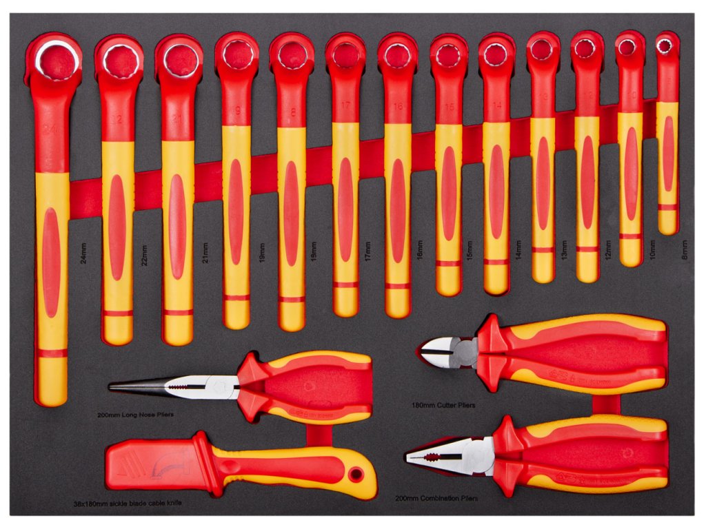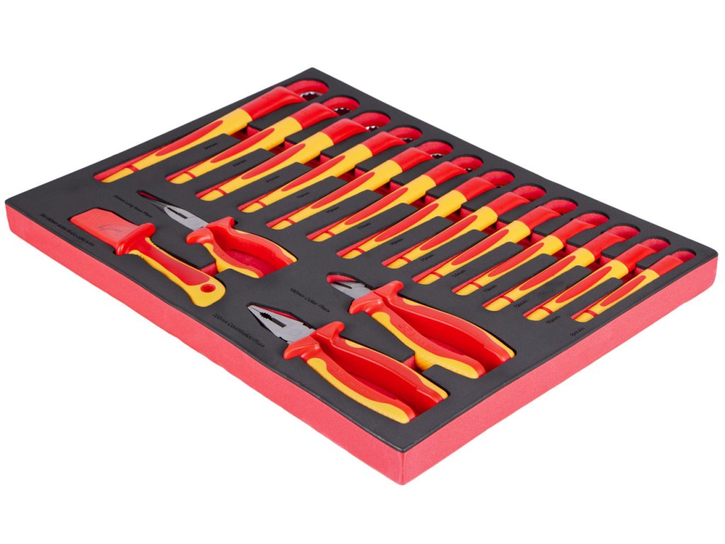 Kompletní VDE sada očkových klíčů a kleští pro práci pod napětím, uložená v tvarované pěnové výplni do dílenského vozíku.