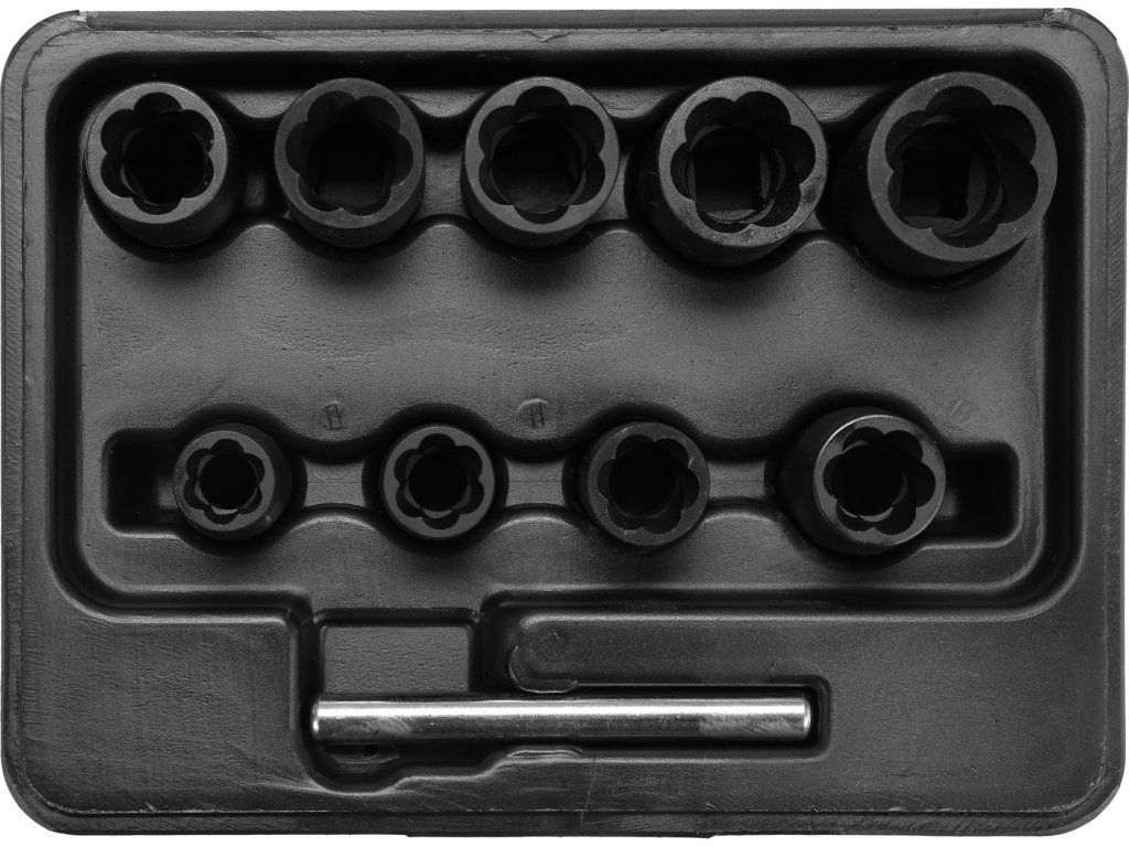 Souprava se skládá z 9 ks různě rozměrově odstupňovaných nástavců a kolíku k odstranění již vytaženého šroubu, nebo matice z vytahováku.