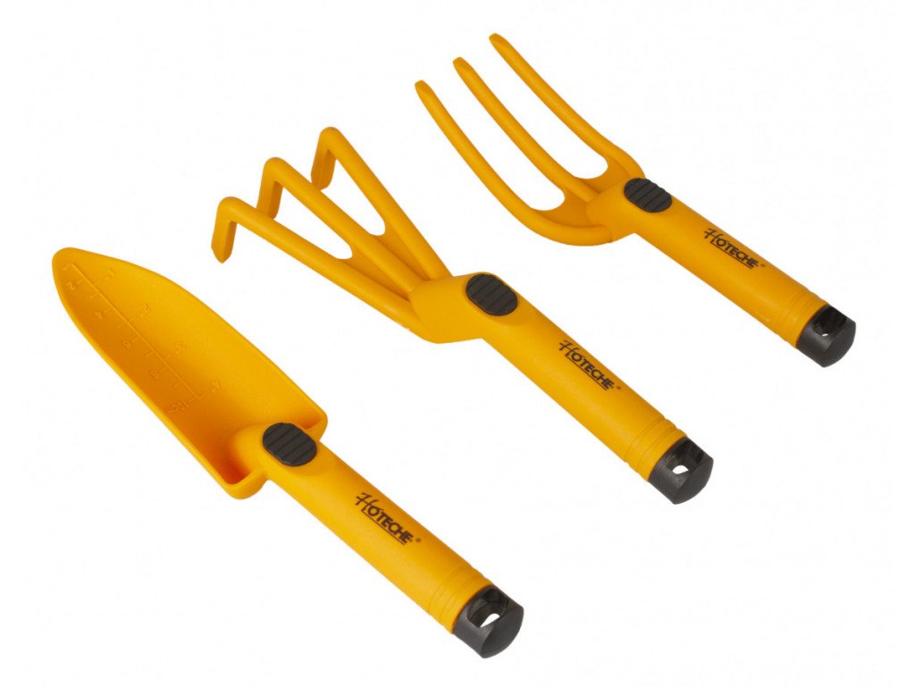 V sadě naleznete lopatku, kultivátor a malé vidle.