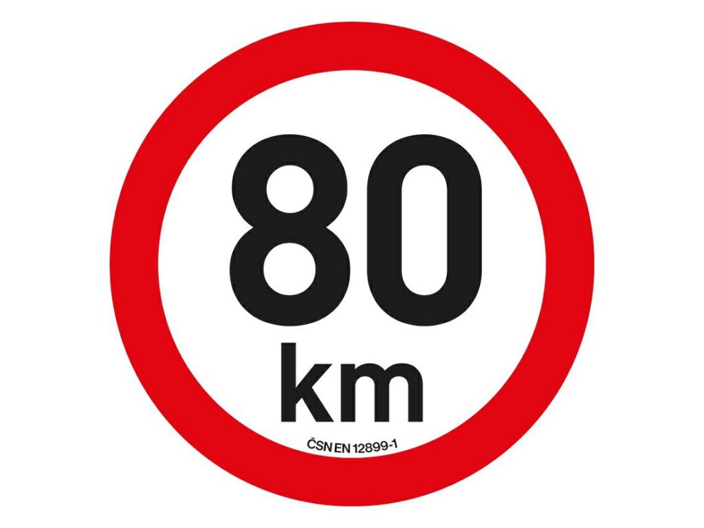 Samolepka o průměru 200 mm s označením nejvyšší povolené rychlosti v provedení z retro reflexní fólie třídy 1 dle ČSN EN 12899-1, odpovídající platnému znění vyhlášky 341/2014 Sb.