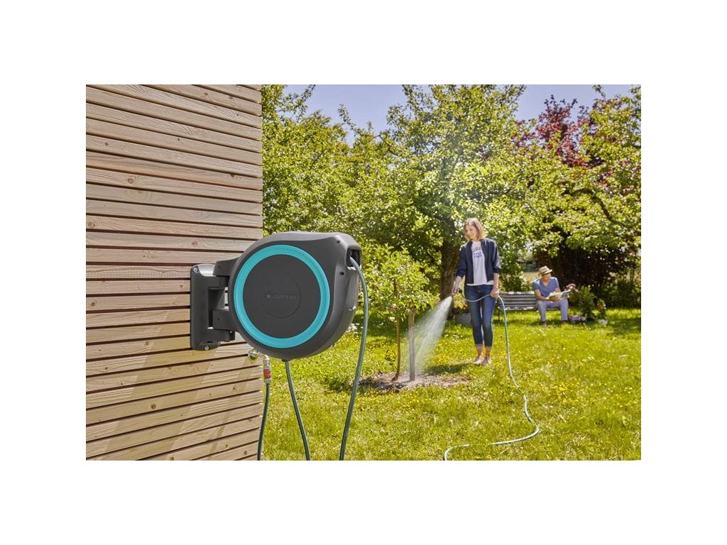 Robustní nástěnný držák umožňuje otáčet boxem na hadici o více než 180°, abyste se bez námahy dostali do všech koutů zahrady. Pro přímé použití jednoduše vytáhnete zahradní hadici na maximální délku 30 metrů. Zahradní hadice se po vytažení automaticky uzamyká po velmi krátkých vzdálenostech, a to znamená, že se s hadicí velmi snadno manipuluje.