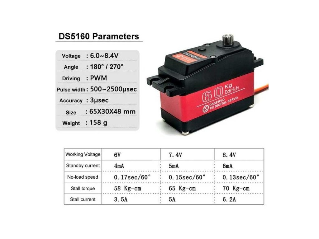 Servo DS5160 270° 60kg, 6-8,4V Servo s rotací, čtyřstupňová převodovka s mosazným pastorkem motoru, mosaznými ozubenými koly s ocelovými pastorky. Výstupní hřídel se otáčí v kuličkovém ložisku, těsnění obstarává ”O” kroužek. TřídílDoplňkové parametry