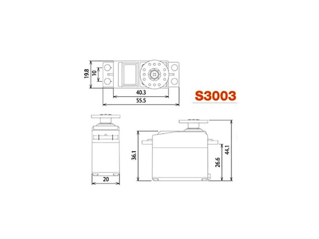 Servo plastové S3003 360° 12kg, plastové převody Servo Tower Pro MG 90 Mikro ServoTřídílná skříň z černého částečně průsvitného plastu je stažená čtyřmi šrouby.