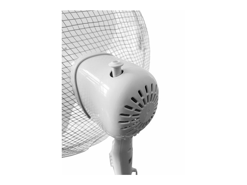 Stojanový ventilátor se třemi rychlostmi, automatickou rotací v úhlu 90° s možností vypnutí, nastavitelným úhlem sklonu a nastavitelnou výškou.