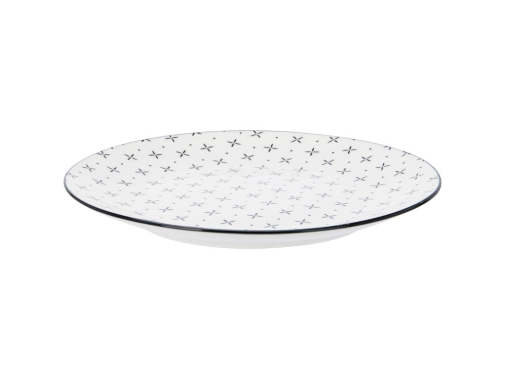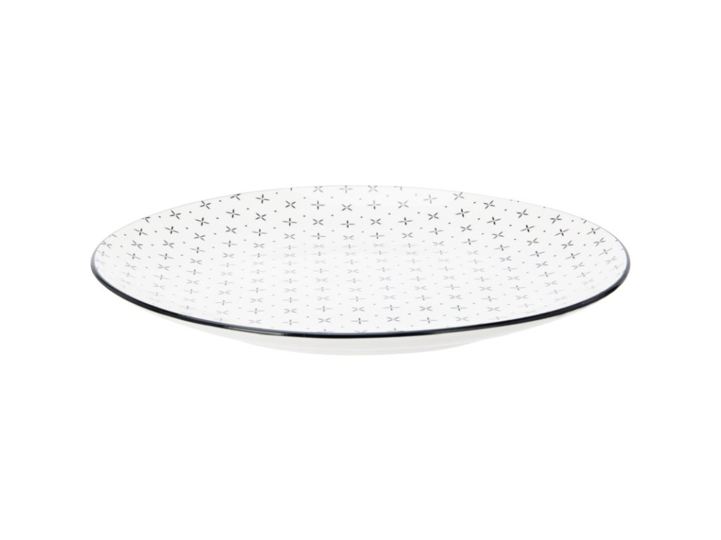 Stylová jídelní sada z kvalitního porcelánu s černým kosočtvercovým vzorem a černým okrajem, ideální pro každodenní i slavnostní stolování.