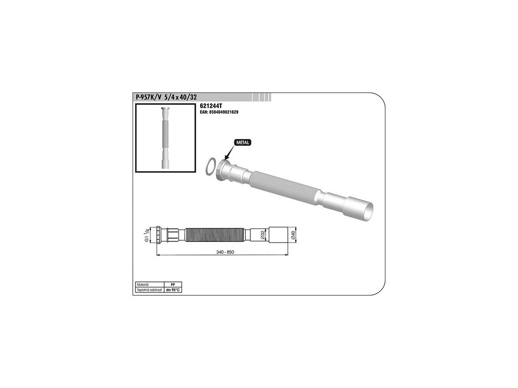 Délka flexibilní 34 až 85 cm.Průměry připojení 32 nebo 40 mm.
