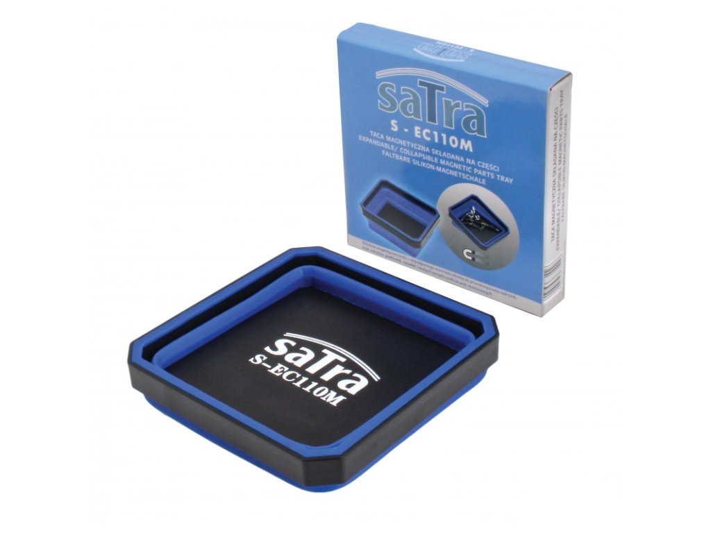 Skládací magnetická miska na drobné předměty, matice, šrouby apod., 110 x 110 mm, výška 2 -5 cm, vyrobeno ze silikonu odolnému vůči oleji se základnou z ABS plastu, s magnety pro přichycení ke kovovému povrchu – SATRA S-EC110M.